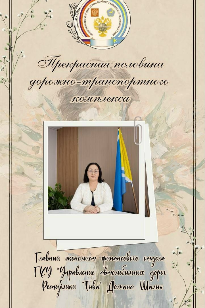 Сегодня мы расскажем вам об одной сотруднице, выбравшей свою судьбу в сфере дорожно-транспортного комплекса. Сегодняшняя героиня нашего рассказа — Шалык Долчана, главный экономист финансового отдела ГКУ «Управление автомобильных дорог Республики Тыва».